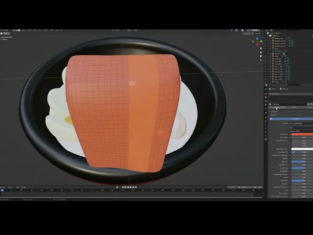 Exploring food modeling techniques while learning from Nicky Blender's tutorials, focusing on texture work and dynamic scene composition.
